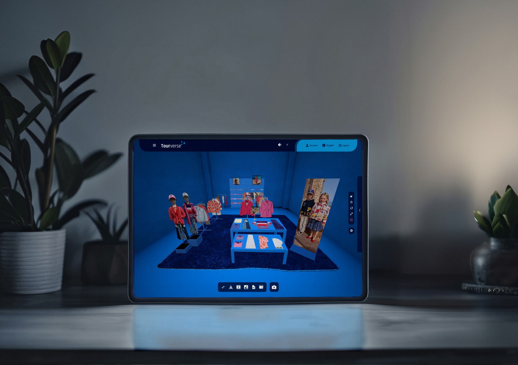 Anzichè creare fisicamente gli allestimenti, dove spesso mancano i capi con cui allestire, oppure manca lo spazio adeguato ed i tempi sono stretti, utilizzando TourVerse è possibile allestire uno showroom virtuale o un focal point specifico tramite applicazione web e visualizzarlo su browser o visore di realtà virtuale.